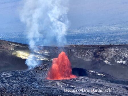 Fontaine de lave (hauteur = 70 m), gaz et soufre dans le cratère Halemaumau du Kilauea à Hawaii. 12 janvier 2026, 8h45 locale (© J.M. Bardintzeff).