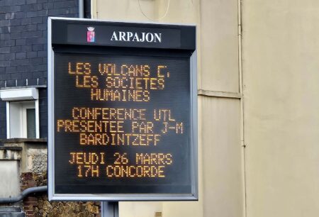 Panneau lumineux annonçant la conférence du volcanologue Jacques-Marie Bardintzeff à Arpajon le 26/3/2026 (© J.M. Bardintzeff).