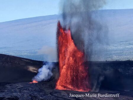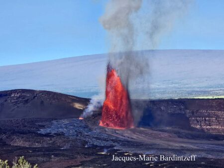 Lors du paroxysme n° 40 du Kilauea à Hawaii, le 12 janvier 2026 à 9h30 locale, la fontaine de lave émise par la bouche nord dans le cratère Halemaumau, dépasse 200 m de hauteur, surmontée par un panache de cendres et de scories ; la bouche sud (à gauche) présente une activité très modeste ; en arrière-plan, la silhouette du Mauna Loa (© J.M. Bardintzeff).