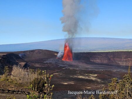 Le paroxysme n° 40 du Kilauea, à Hawaii, dans le cratère Halemaumau, a débuté le 12 janvier 2026 à 8h22 du matin heure locale. Une heure plus tard, la fontaine de lave, spectaculaire, dépasse 200 m de hauteur.