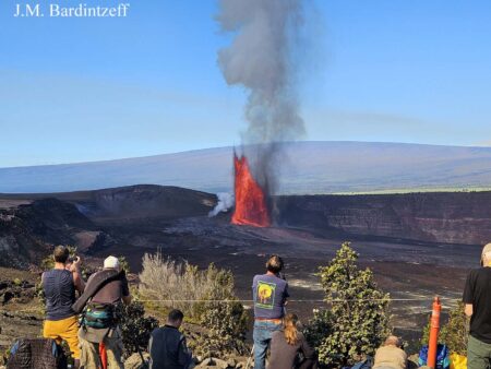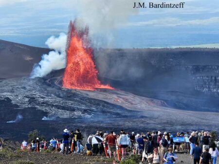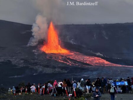 L’éruption actuelle du Kilauea à Hawaii a débuté le 23 décembre 2024. Des paroxysmes se succèdent tous les 8-30 jours dans le cratère Halemaumau, avec des fontaines de lave de 300 m de haut pendant plusieurs heures. Le paroxysme n° 44 a eu lieu le 9 avril 2026. Des points d’observation sécurisés sont aménagés au sein du parc national et le public vient en nombre dans une ambiance « bon enfant ». Une opportunité exceptionnelle d’assister à une éruption aussi spectaculaire !