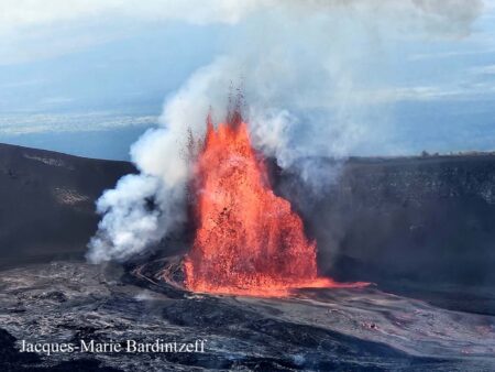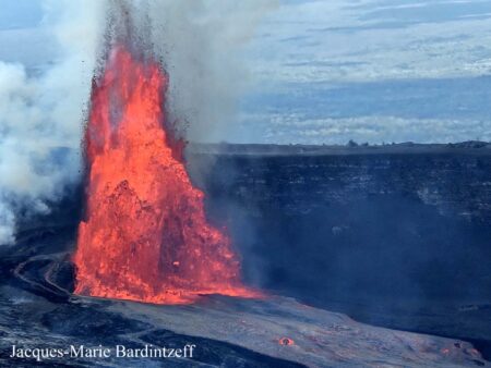 12 janvier 2026 à 11h36 locale, dans le cratère Halemaumau du Kilauea à Hawaiil lors du paroxysme n° 40 : la fontaine de lave atteint presque 200 m de hauteur et donne naissance à une importante coulée de lave (qui s’épanche sur la droite de la photo) (© J.M. Bardintzeff).