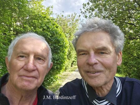 Jean-Paul Ollivier (à gauche), journaliste sportif, et Jacques-Marie Bardintzeff, volcanologue, dimanche 19 avril 2026 après-midi, au parc des Glacières de Boulogne-Billancourt (© J.M. Bardintzeff).