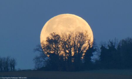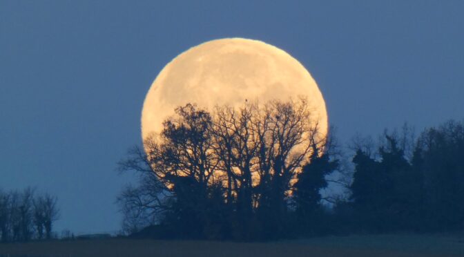 Pour la Lune, l’année 2026 a débuté ce matin avec la première Pleine Lune. C’est un joli spectacle que j’ai pu immortaliser à l’aube depuis les Monts du Beaujolais. Au Nord-Ouest, le globe sélène s’est glissé lentement derrière un bosquet d’arbres au sommet d’une colline. Quelques instants plus tard, le Soleil faisait son apparition à l’opposé. Sur le cliché que j’ai pris avec mon boîtier Panasonic FZ82, on devine la présence d’un oiseau sur une branche :
