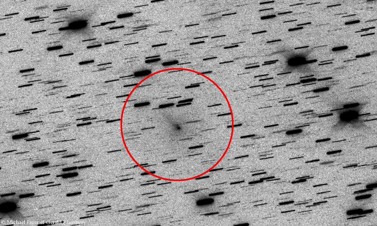 Le 13 janvier, la nuit est belle au Chili. Comme il le raconte sur son blog, Alain Maury en fait profiter un couple d’astronomes amateurs américains. Puis, avant d’aller se coucher, il jette un coup d’œil aux images enregistrées cette nuit-là. Le logiciel a détecté un objet inconnu non répertorié, entouré d’un faible halo. Il s’agit bien d’une comète, la huitième découverte par l’équipe. Elle se trouve alors dans la petite constellation australe de la Colombe, et sa magnitude est de 17,8. Trois jours plus tard, l’astre chevelu, photographié par Michael Jäger et Gerald Rhemann, a déjà gagné en luminosité :