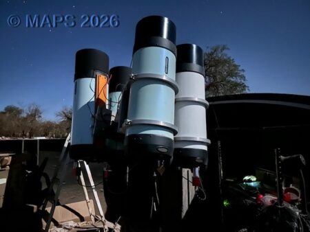 De toute évidence, la découverte de 6AC4721 (dénomination provisoire) ne doit rien au hasard. C’est en effet la huitième comète à mettre au crédit du programme MAPS. Sans parler des astéroïdes : plus d’une centaine en 2025, de quoi faire rêver bien des professionnels. Mais qui sont donc les quatre mousquetaires de MAPS (initiales de Maury, Attard, Parrott et Signoret), tous amateurs ? Alain Maury a monté son observatoire (SpaceObs) dans le désert d’Atacama au Chili, où il accueille les amoureux des étoiles. Pendant qu’il leur fait admirer les beautés du ciel nocturne austral, quatre télescopes de Schmidt de 28 centimètres de diamètre (f/2,2) entièrement automatisés traquent astéroïdes et comètes :