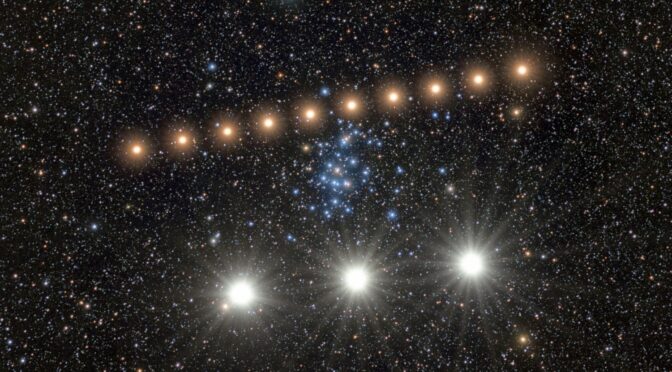 En 2025, deux planètes sont venues saluer ce bel amas : Mars au printemps, et Vénus à la fin de l’été. La première présente une belle couleur rouille, car sa surface est recouverte d’une poussière riche en oxyde de fer. Quant à la seconde, entourée d’une épaisse couche de nuages, elle brille d’un blanc intense. L’astrophotographe Petr Horálek a immortalisé ces visites planétaires :