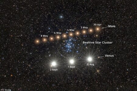 En 2025, les planètes Mars et Vénus sont passées à proximité de l’amas d’étoiles de la Crèche, dans la constellation du Cancer.