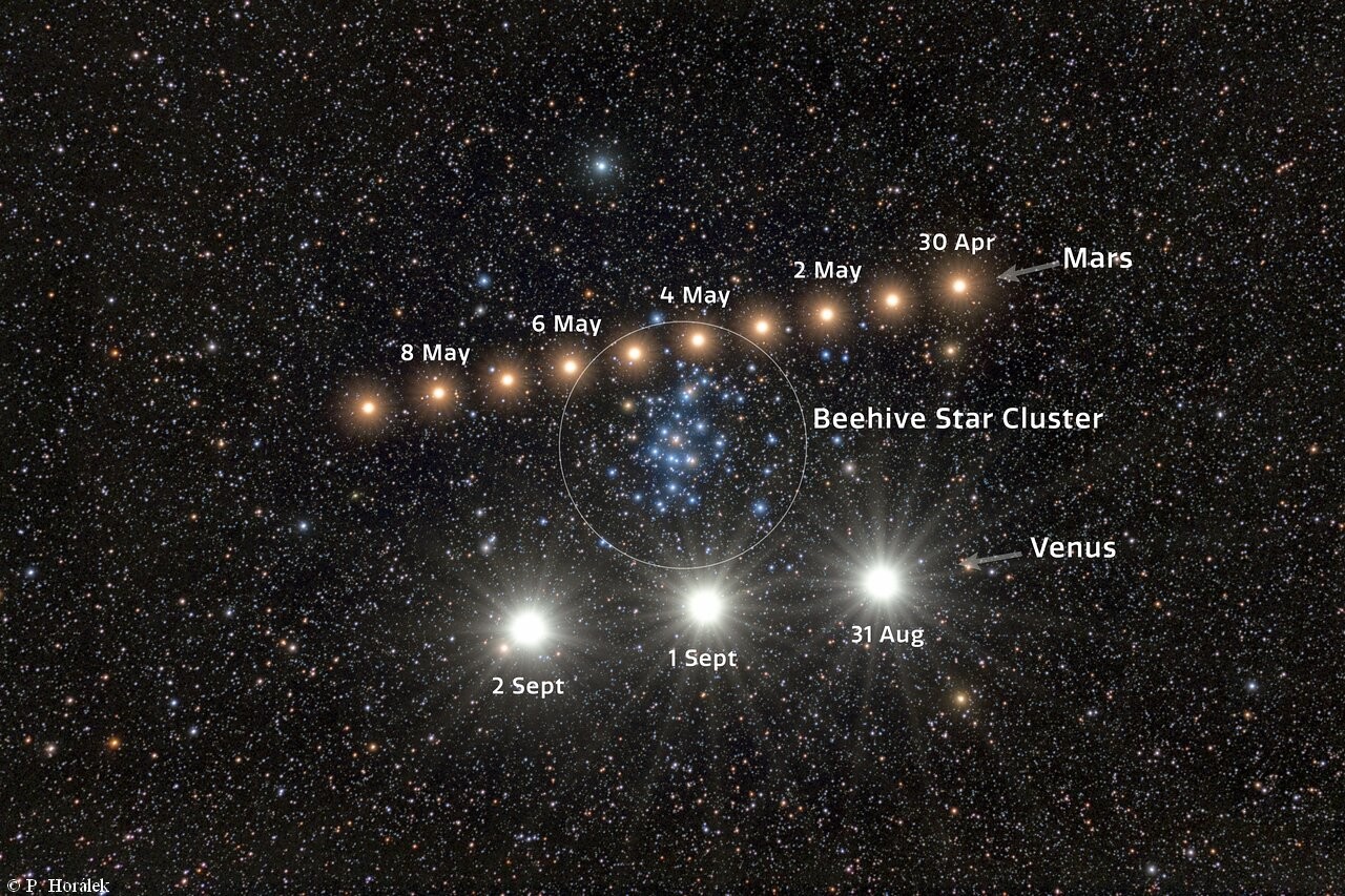 En 2025, les planètes Mars et Vénus sont passées à proximité de l’amas d’étoiles de la Crèche, dans la constellation du Cancer.