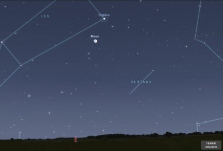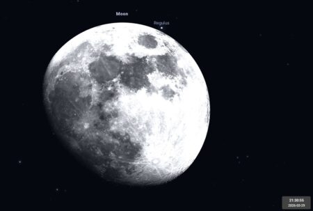- Le 2 au soir, la Lune presque pleine accompagne l’étoile Régulus du Lion.