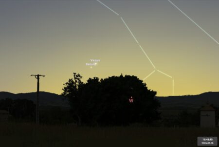 - Le 8 en début de soirée, essayez de repérer le couple Saturne Vénus juste au-dessus de l’horizon Ouest. Une paire de jumelles peut s’avérer nécessaire en raison de la luminosité du ciel.