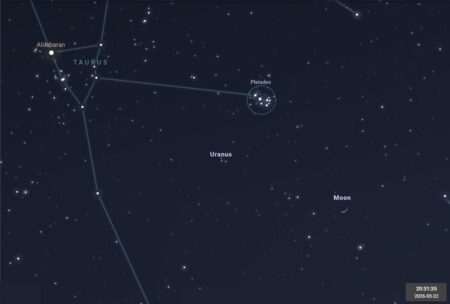- Le 22 en soirée, explorez aux jumelles la Lune et ses environs. Outre la lumière cendrée, vous pourrez admirer l’amas d’étoiles des Pléiades et la discrète Uranus.