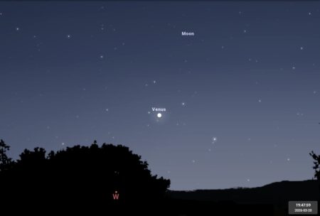 - Le 20, c’est l’équinoxe de printemps. Au crépuscule, un très fin croissant de Lune surplombe Vénus.