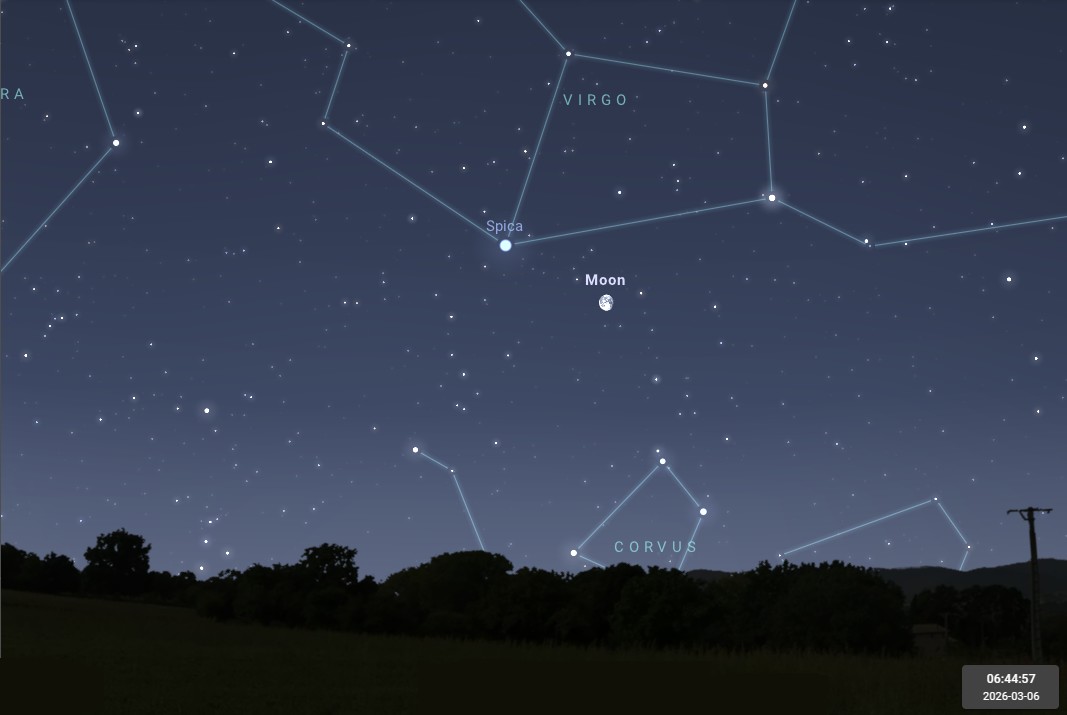 - Le 6 avant l’aube, c’est Spica de la Vierge qui brille non loin de la Lune gibbeuse décroissante.