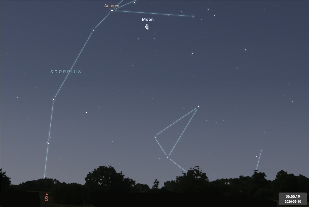 - Le 10 à l’aube, Antarès du Scorpion se tient aux côtés de la Lune, à la veille du Dernier quartier.