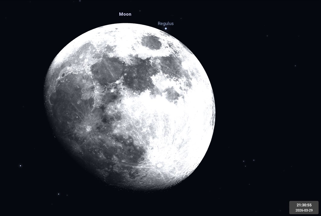 - Le 29, passage à l’heure d’été. La Lune gibbeuse croissante occulte Régulus du Lion en soirée. L’émersion de l’étoile se produit à 21h30 (l’immersion à 20h15 risque d’être difficile à observer dans un ciel très clair).