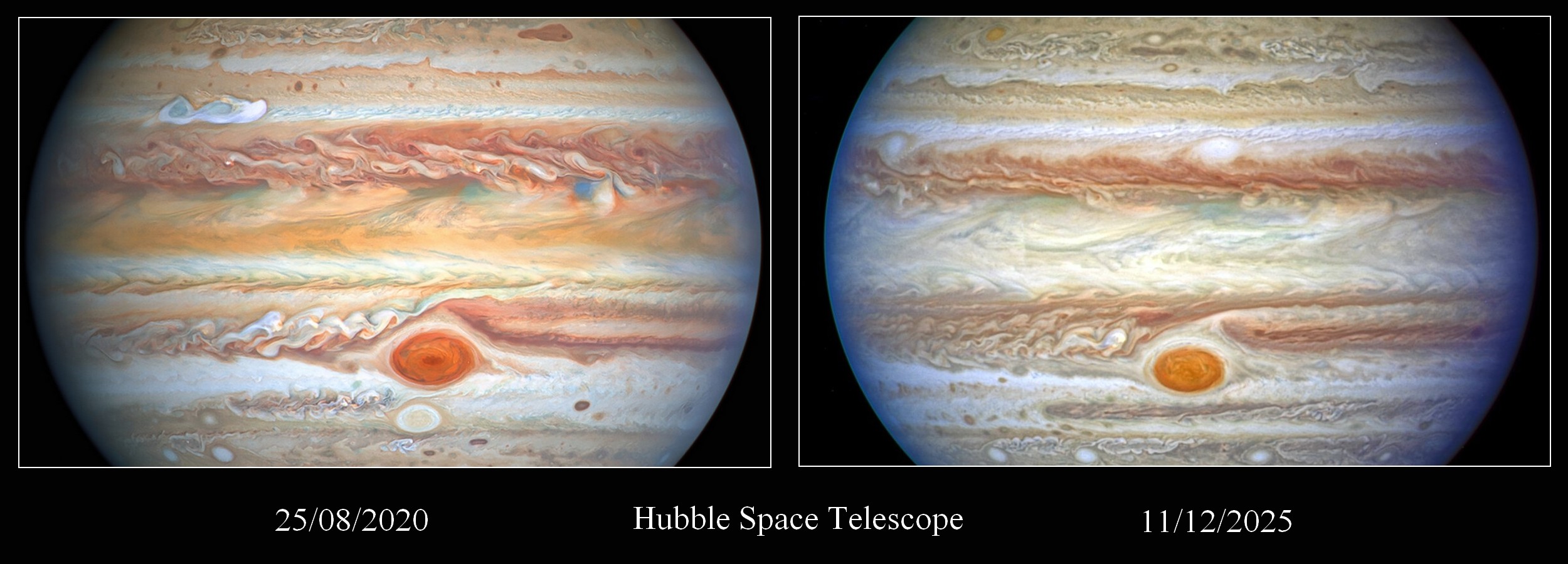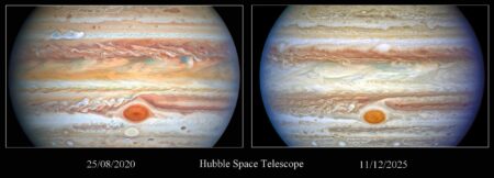 Avec la puissance du télescope spatial Hubble (HST), plus besoin d’attendre qu’une sonde se mette en orbite autour de Jupiter pour en avoir des vues détaillées. Les clichés pris à intervalles réguliers révèlent l’évolution permanente de la couche nuageuse :