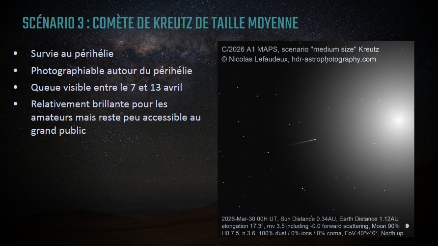 Dans un récent article, l’astrophotographe Nicolas Lefaudeux propose plusieurs scénarios d’évolution de la comète. Les spécialistes s’accordent actuellement sur la troisième option :