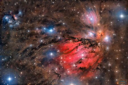 Pour parvenir à ce résultat, les huit membres du groupe n’ont pas lésiné sur les moyens. Ils ont cumulé (à distance) plus de 43 heures de poses avec un télescope de 45 centimètres de diamètre situé au Chili. Une façon d’opérer que je vous avais décrite dans l’article l’astrophoto à distance, comment ça marche ? Sur cette image, qui évoque la palette d’un peintre, on distingue les trois types de nébuleuses. La partie rouge est caractéristique des nébuleuses en émission. Les nébuleuses par réflexion, quant à elles, se concentrent autour de jeunes étoiles bleutées. Enfin, de délicats rubans sombres correspondent aux nébuleuses obscures. Je vous recommande vivement d’aller explorer l’image plein format.
