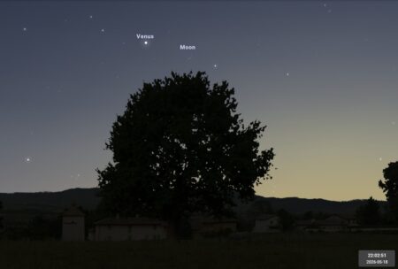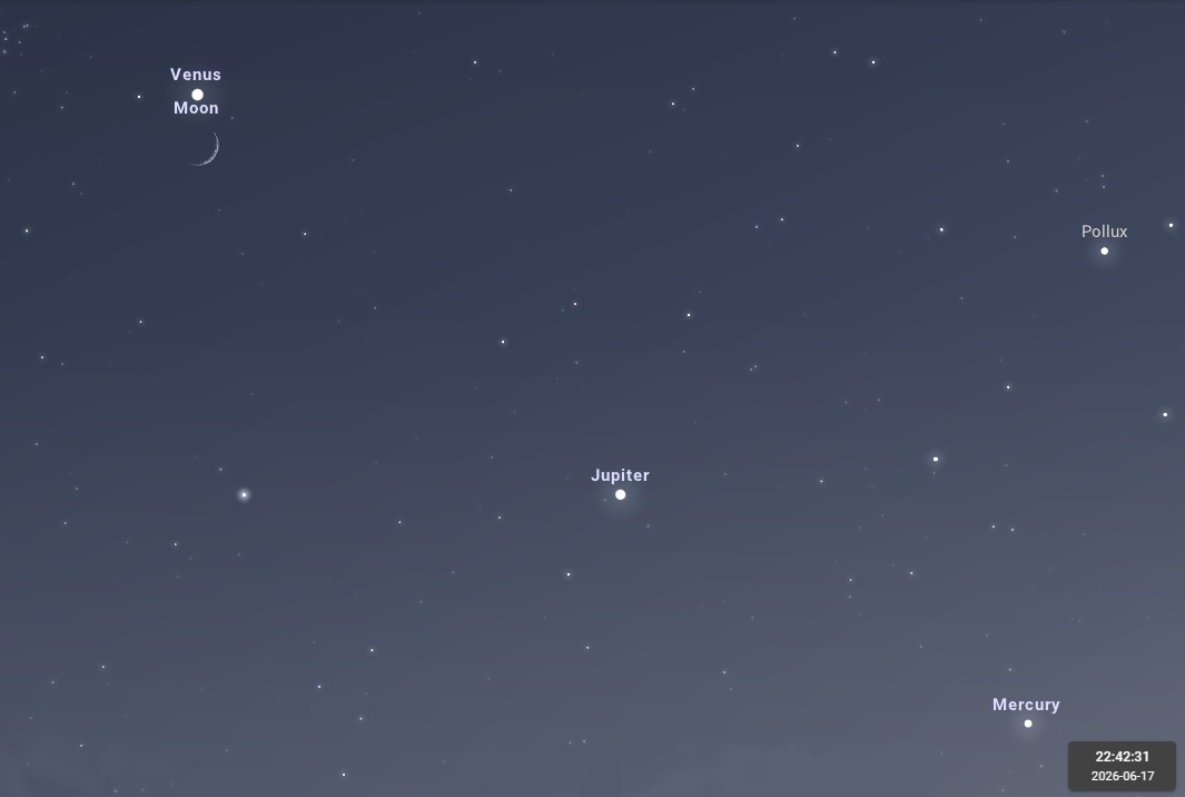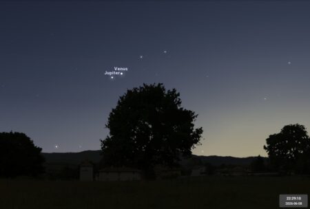 - 8 juin : rencontre avec Jupiter, légèrement moins lumineuse. Point d’orgue d’un rapprochement apparent entre les deux astres, qu’on peut suivre les soirs précédents.