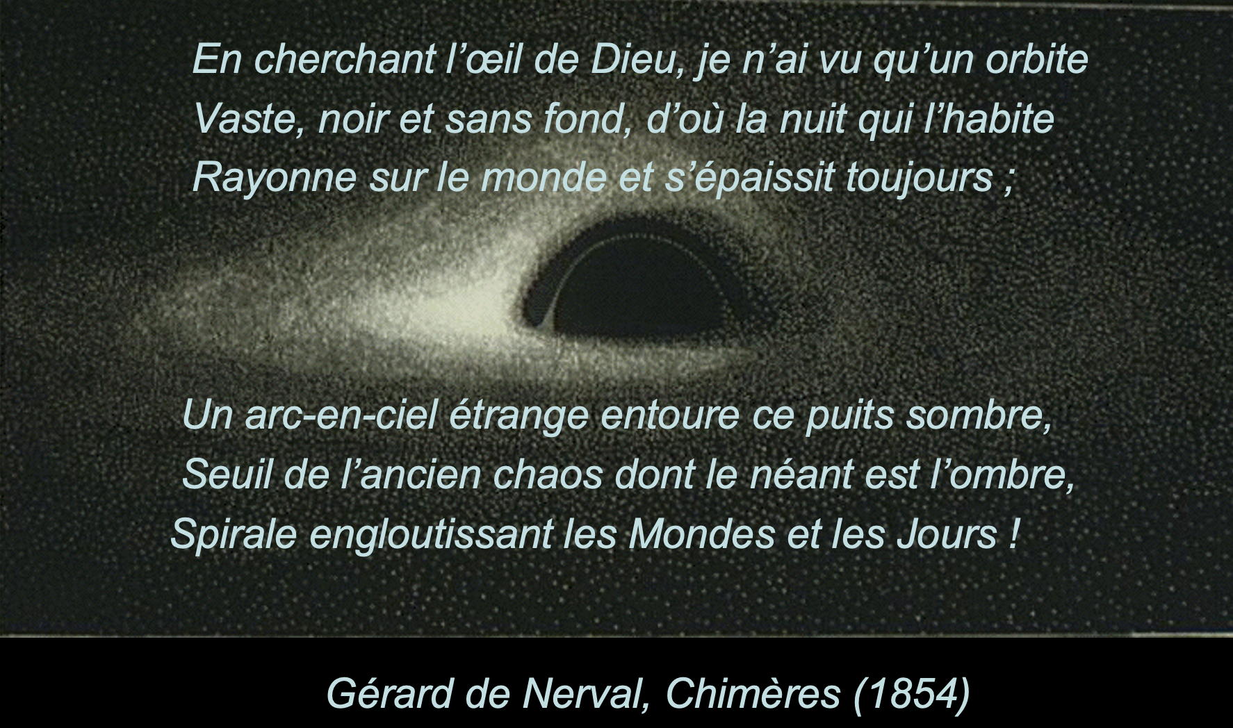 En 1854 le poète français Gérard de Nerval, dans Le Christ aux Oliviers, décrit de façon incroyable un puits sombre où les mondes, les jours tourbillonnent et s’engouffrent, à une époque où on ne parlait pas de ces objets astrophysiques.