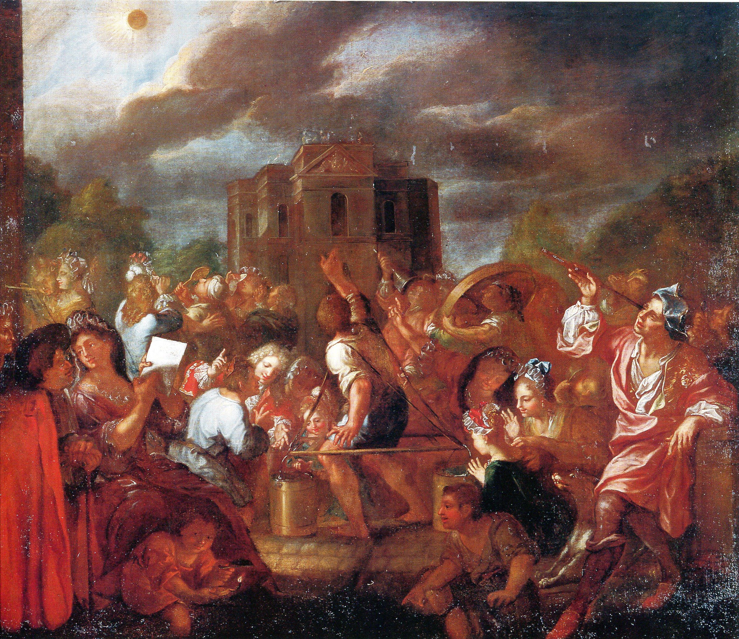 L’éclipse du 22 mai 1724, dite de Louis XV car le jeune roi, âgé de 14 ans, la vit, fut la dernière éclipse totale vue à Paris (la prochaine n’y sera visible que le 3 septembre 2081), a de façon certaine l’objet d’une grande toile, conservée au Musée de l’Observatoire de Paris. Mais à ma connaissance son auteur est anonyme, et sa date de réalisation incertaine. Elle a cependant ma préférence, d’une part parce qu’elle est débarrassée de son symbole religieux, d’autre part et surtout parce qu’elle montre à quel point l’événement suscita la curiosité de la foule, lui donnant l’occasion d’observer le phénomène de nombreuses manières : directement à travers des lunettes, verres fumés, orifices, tamis et filtres divers, ou indirectement, par réflexion dans un seau d’eau. Les astronomes professionnels, quant à eux, l’étudièrent à l’Observatoire de Paris récemment construit par l’architecte Claude Perrault, depuis la terrasse où je suis moi-même monté maintes fois…