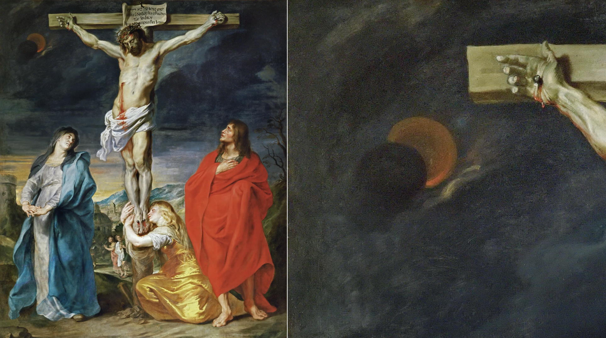 À cet égard, la Crucifixion de Cornelis de Vos, et mieux encore celle du Hollandais Anton van Dyck, peinte entre 1617 et 1619, représentent plus fidèlement les tailles identiques des deux astres.