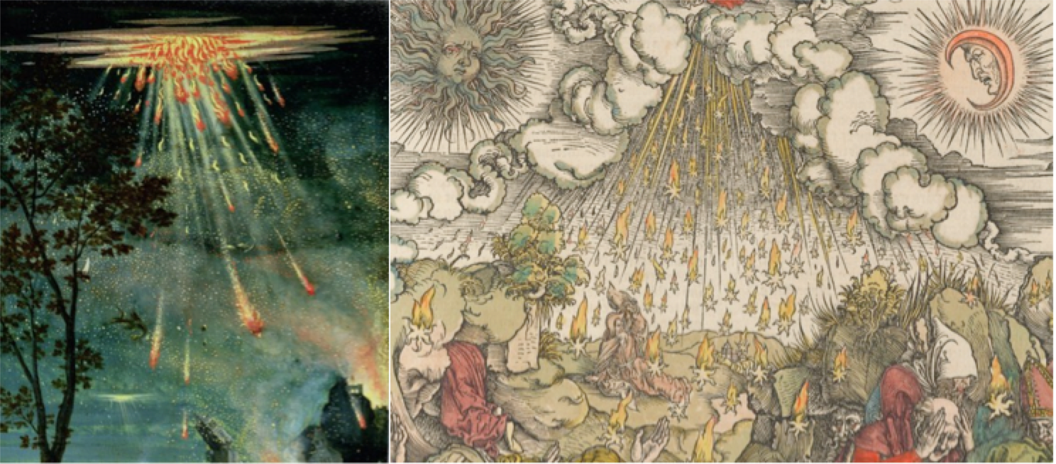 La lumière joue un rôle crucial dans la tableau. Les flammes célestes éclairent la scène nocturne, créant des contrastes saisissants entre ombre et clarté. Cette utilisation dramatique de la lumière accentue le caractère fantastique et surnaturel de la scène. La pluie de feu tombant du ciel n’est pas sans rappeler la gravure de Dürer Ouverture des 5e et 6e sceaux, dans sa série de L’Apocalypse : « Je regardai, quand il ouvrit le sixième sceau ; et il y eut un grand tremblement de terre, le soleil devint noir comme un sac de crin, la lune entière devint comme du sang, et les étoiles du ciel tombèrent sur la terre. (Ap. 6). »