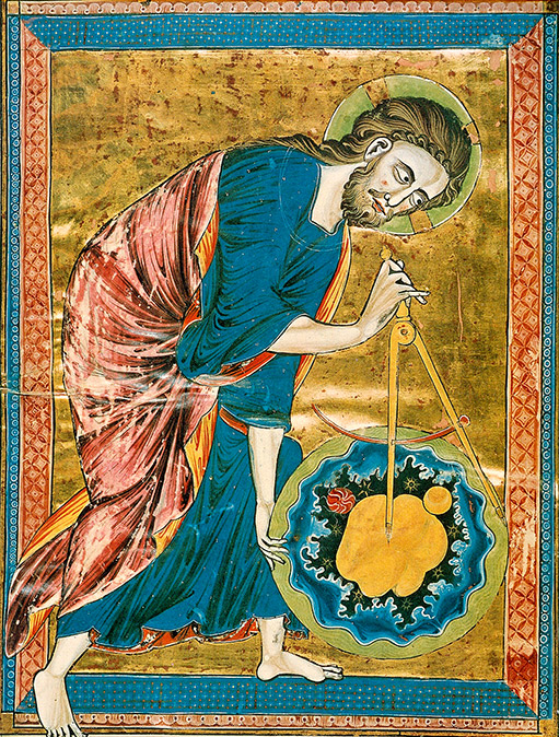 Il existe de nombreuses autres représentations du concept de Dieu architecte. Les enluminures médiévales d’une Bible moralisée du XIIIᵉ siècle le montrent créant le monde avec un compas, instrument qui symbolise l’ordre divin, l’harmonie, la rationalité du cosmos bâti selon des proportions parfaites. Certaines mosaïques byzantines montrent également le Démiurge organisant le chaos et façonnant l’univers selon des lois mathématiques en créant le cercle, le carré, la sphère. La géométrie est un attribut divin. Comprendre l’ordre géométrique du monde, c’est s’approcher de la connaissance de Dieu. Dans la symbolique maçonnique, le compas et l’équerre sont les symboles du Grand Architecte. Le monde est supposé être un édifice intelligible, l’homme initié peut en apprendre les secrets en étudiant les formes, les mesures, les proportions.