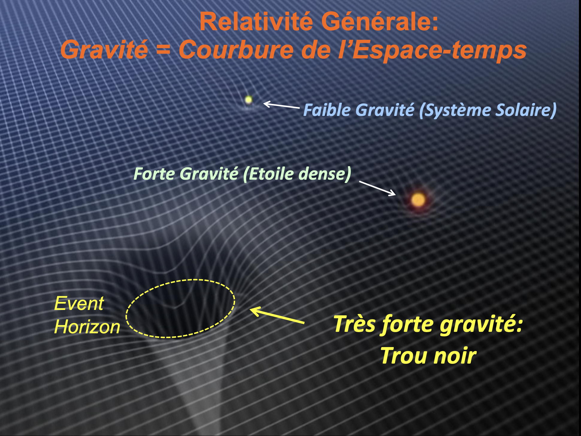 Ce n’est pas un trou que l’on fait dans la Terre ou dans l’espace, c’est la gravitation qui creuse ce puits. J’utilise souvent l’image du tissu élastique de l’espace et du temps. La relativité générale nous explique que l’espace-temps n’est pas une structure rigide comme on le croyait depuis Newton, mais une structure souple et élastique dont les formes sont dictées par la présence de corps massifs. Donc, un corps plus compact génère des déformations plus importantes du tissu élastique. Cela se traduit mathématiquement par les équations d’Einstein.
